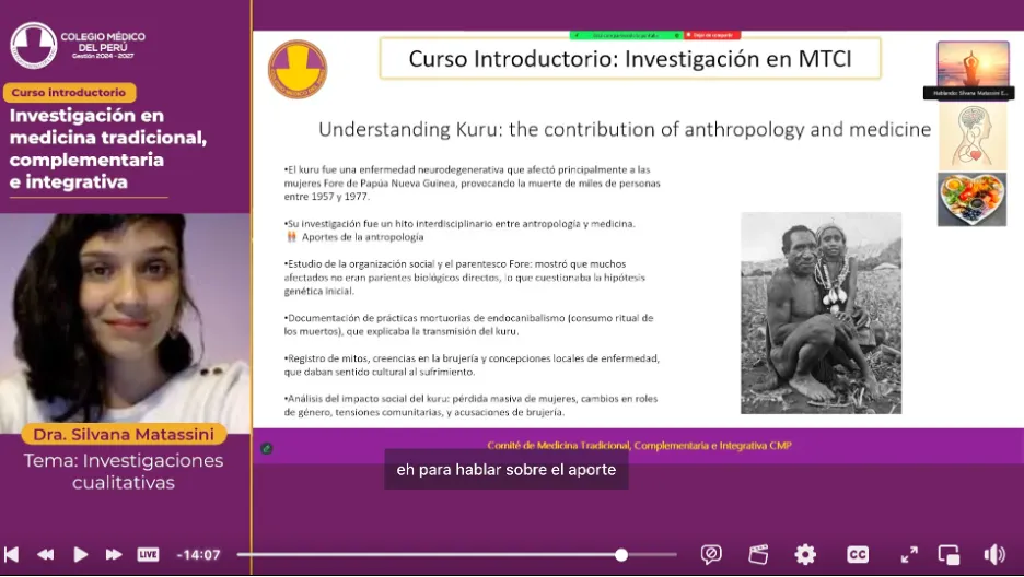 I had the opportunity to participate in the Introductory Course on Traditional and Complementary Medicine organized by the Colegio Médico del Perú (Peruvian College of Physicians). In my session, I spoke about medical anthropology, qualitative research, and their contributions to understanding health and illness.